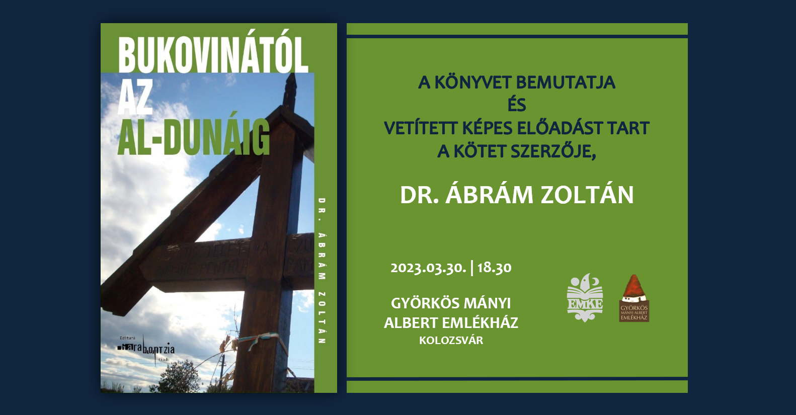 A bukovinai székelyek története címmel Dr. Ábrám Zoltán orvos, közíró, az EMKE alelnöke tart előadást, valamint bemutatja a Bukovinától az Al-Dunáig című, 2019-ben a Garabontzia Könyvkiadó gondozásában megjelent könyvét 2023. március 30-án, csütörtökön, 18.30 órától a Györkös Mányi Albert Emlékházban (Kolozsvár, Republicii / Majális u. 5.). Az előadás a bukovinai székelyek leszármazottairól, hangsúlyosan az Al-Duna mentére letelepedettekről szól.