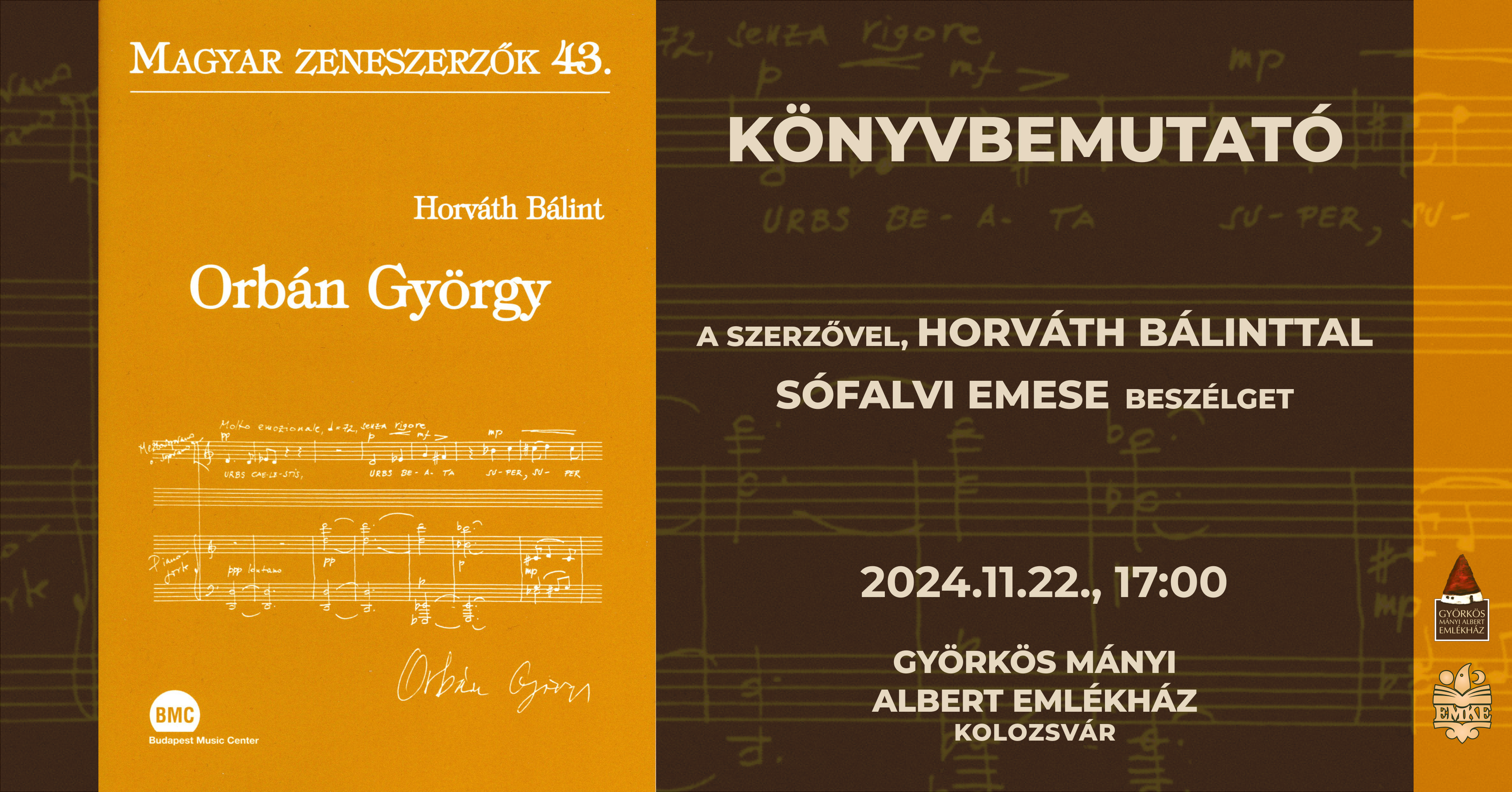Horváth Bálint zeneszerző, tanár Orbán György Kossuth- és Erkel Ferenc-díjas zeneszerzőről készült kismonográfiáját mutatjuk be 2024. november 22-én, pénteken, 17 órakor a Györkös Mányi Albert Emlékházban (Kolozsvár, Republicii / Majális u. 5.)