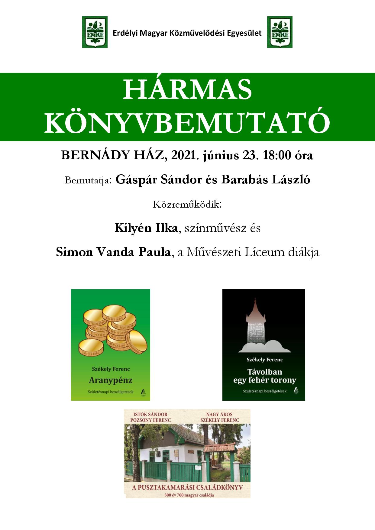 únius 23-án du. 6 órakor mutatják be a Bernády-házban Székely Ferenc Távolban egy fehér torony és Aranypénz című, jeles erdélyi személyiségekkel készült interjúkötetét, valamint A pusztakamarási családkönyvet, amely a Pusztakamráson élő magyarok 300 éves családtörténetét tartalmazza.